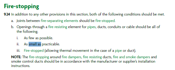 So, if we create one penetration in our compartment wall big enough to run all the services through and then fire stop that penetration, shouldn't that be good enough and in line with guidance from ADB? Unfortunately, it is not as simple as that, if we look at the note from ADB above that talks specifically about fire dampers, fire-resisting ducts, fire and smoke dampers and smoke control dampers. ADB mentions this because ductwork and dampers are tested to a standard that is different to the standard used for other service types. In essence, this means that ductwork and dampers cannot be run through the same penetration as other service types such as pipework, cables conduits etc. Your chosen damper manufacturer should be consulted to obtain the fire-stopping details for their dampers, and this should be incorporated into the design of the service penetrations in your compartment walls.